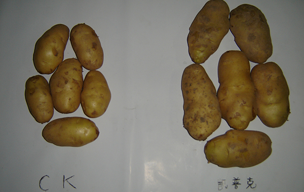 河南鄭州市滎陽高村農(nóng)民黃海望,共種6畝馬鈴薯,其中5畝用的眾德套餐,眾德生物有機(jī)肥80公斤,15-10-20高鉀型眾德牌摻混肥100斤在翻地前施用,100斤15-10-20高鉀型眾德牌摻混肥種肥同播,出苗后用態(tài)康科250倍液噴施兩次,另外一畝做對照,同等有機(jī)肥,100公斤15-15-15含量的復(fù)合肥作底肥。施用眾德牌摻混肥的馬鈴薯莖葉不旺長,發(fā)根早、根粗、苗壯,中期苗高比對照高15-20厘米,長勢好、病害少,收獲時馬鈴薯個頭大、品質(zhì)好、表面光滑,上市早,賣價高,產(chǎn)量比對照高58-60%,畝產(chǎn)達(dá)到6100多斤。
